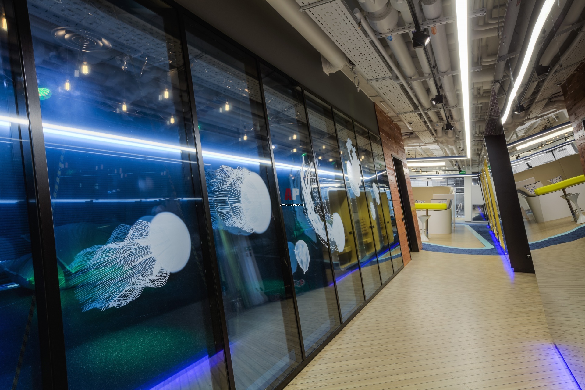За стеклянными перегородками расположены переговорные. Перегородки матированы солнцезащитной пленкой, которую используют для иллюминаторов яхт, отчего снаружи через пленку со светоотражающим эффектом практически не видно, что происходит в переговорной.