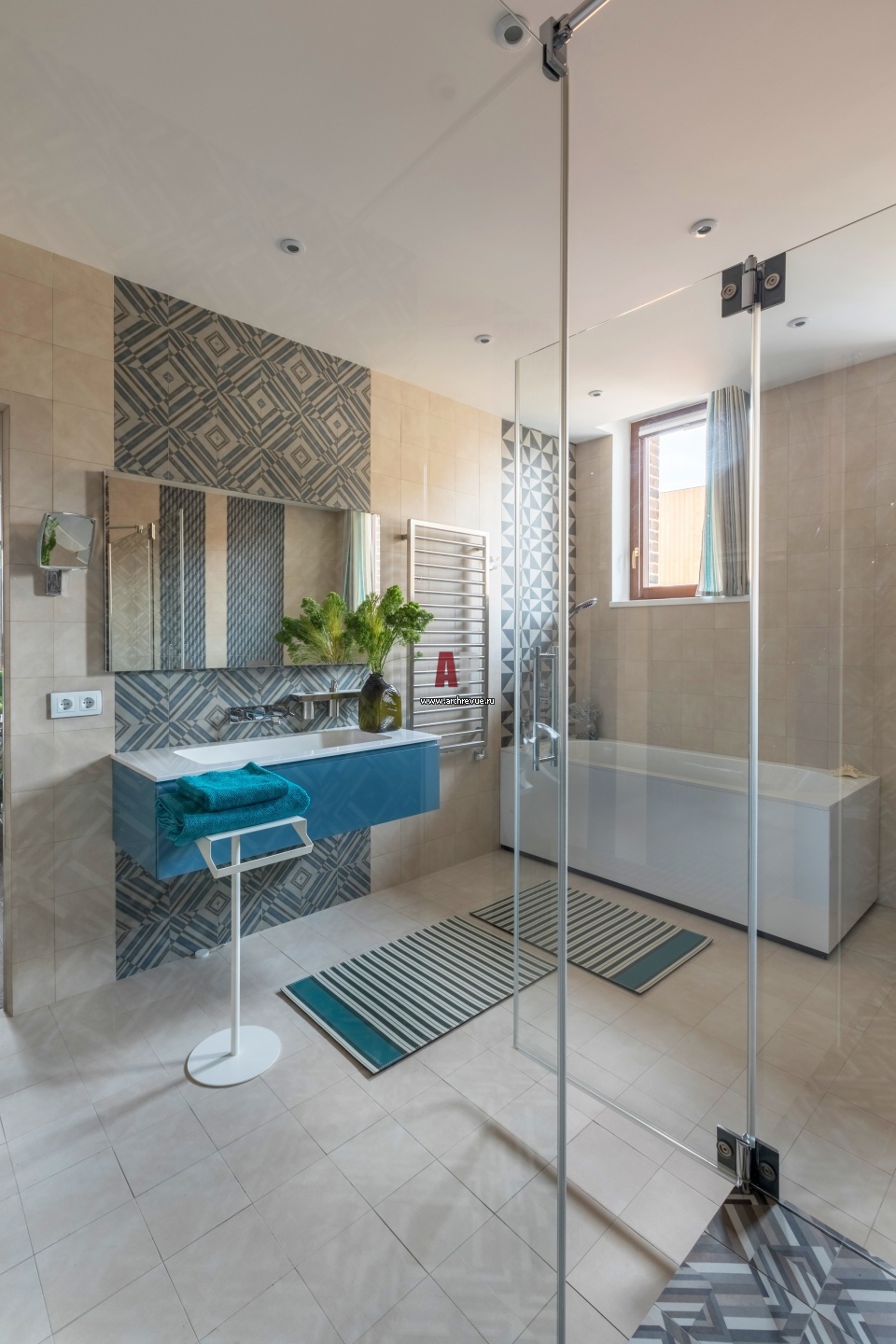 Интерьер санузла при спальне одного из сыновей выполнен в синей гамме. Плитка Mutina по дизайну Патрисии Уркиолы. Ванна Villeroy & Boch. Мебель, зеркало Oasis.
