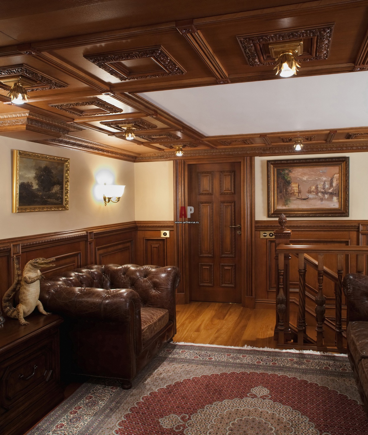 Зона отдыха на втором уровне в неоклассике с отсылками к традиционному английскому стилю.