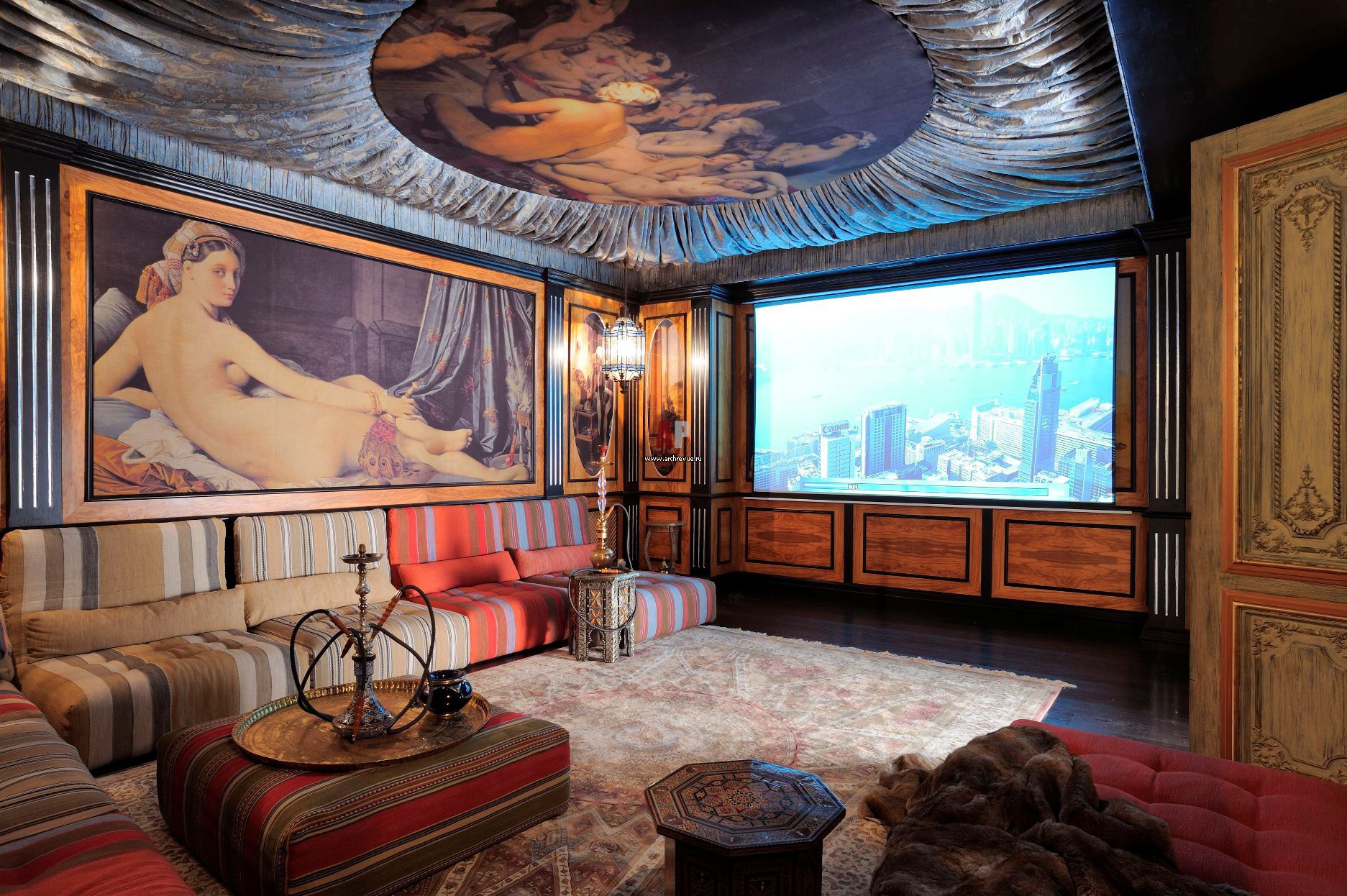 Домашний кинотеатр с кальянной декорирован с восточной роскошью. На стене и на плафоне - напечатанные на ткани знаменитые картины работы Энгра «Большая одалиска» и «Турецкая баня», изготовление «Скиф ». Мягкая мебель, Beni.