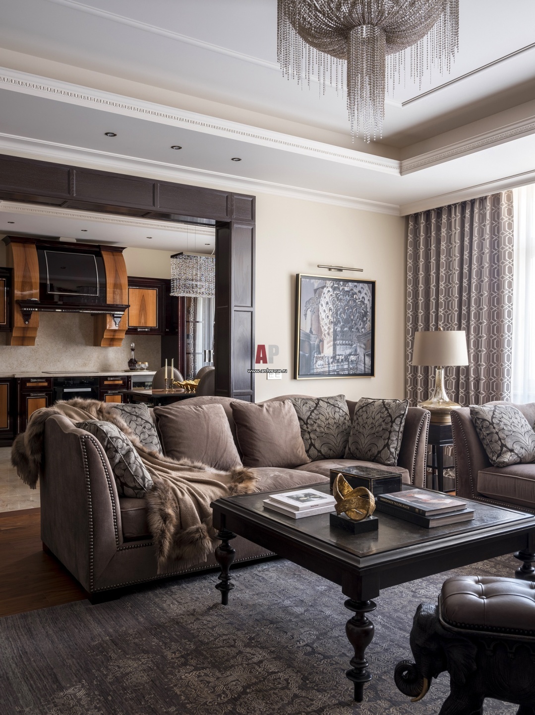 Представительский интерьер для бизнесмена. Вид из гостиной на кухню. Кухня из экзотического дерева, Brummel Cucine.