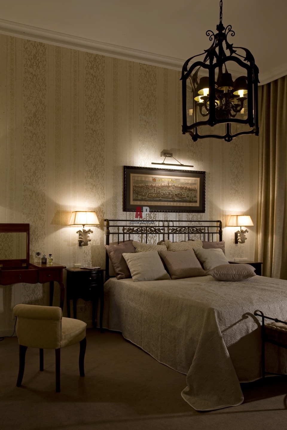 В колористическом оформлении хозяйской спальни преобладают белый, молочный и цвет слоновой кости. Изголовье кровати украшено ковкой. На стенах – английские бумажные обои.