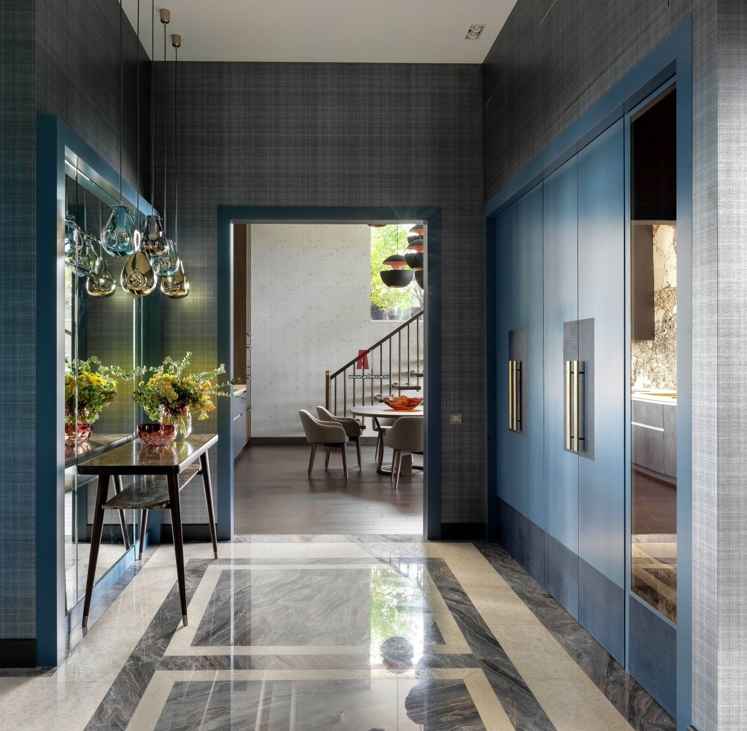 Интерьер холла. Вид на гостиную. Встроенные шкафы тилового цвета изготовлены по эскизам автора проекта. Ручки на дверях выполнены из латуни. Консоль, Porada. Подвесные светильники, Bomma.