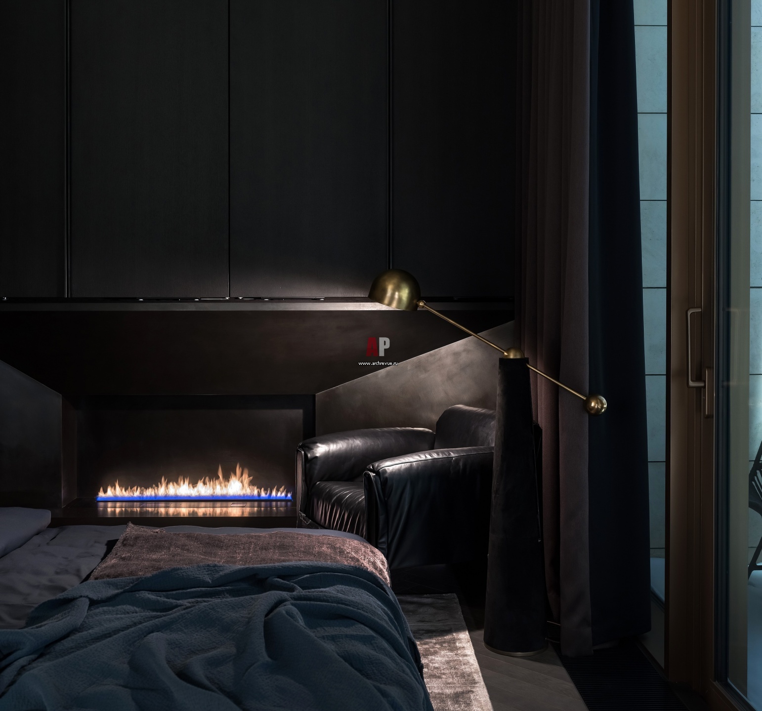 Зона камина в мастер-спальне. Портал отделен металлом. Панели из чесаного шпона. Кресло, Piet Boon. Торшер, Apparatus.