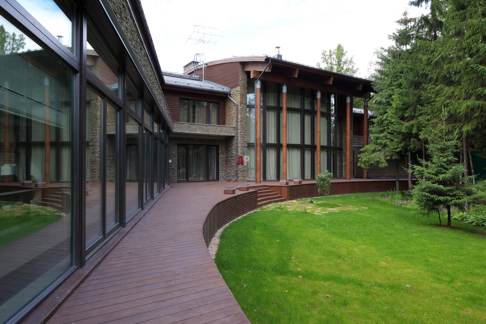 Вытянутый по форме дом составлен из двух прямоугольных блоков, соединенных открытой террасой в виде полукруглого подиума, зашитого доской.