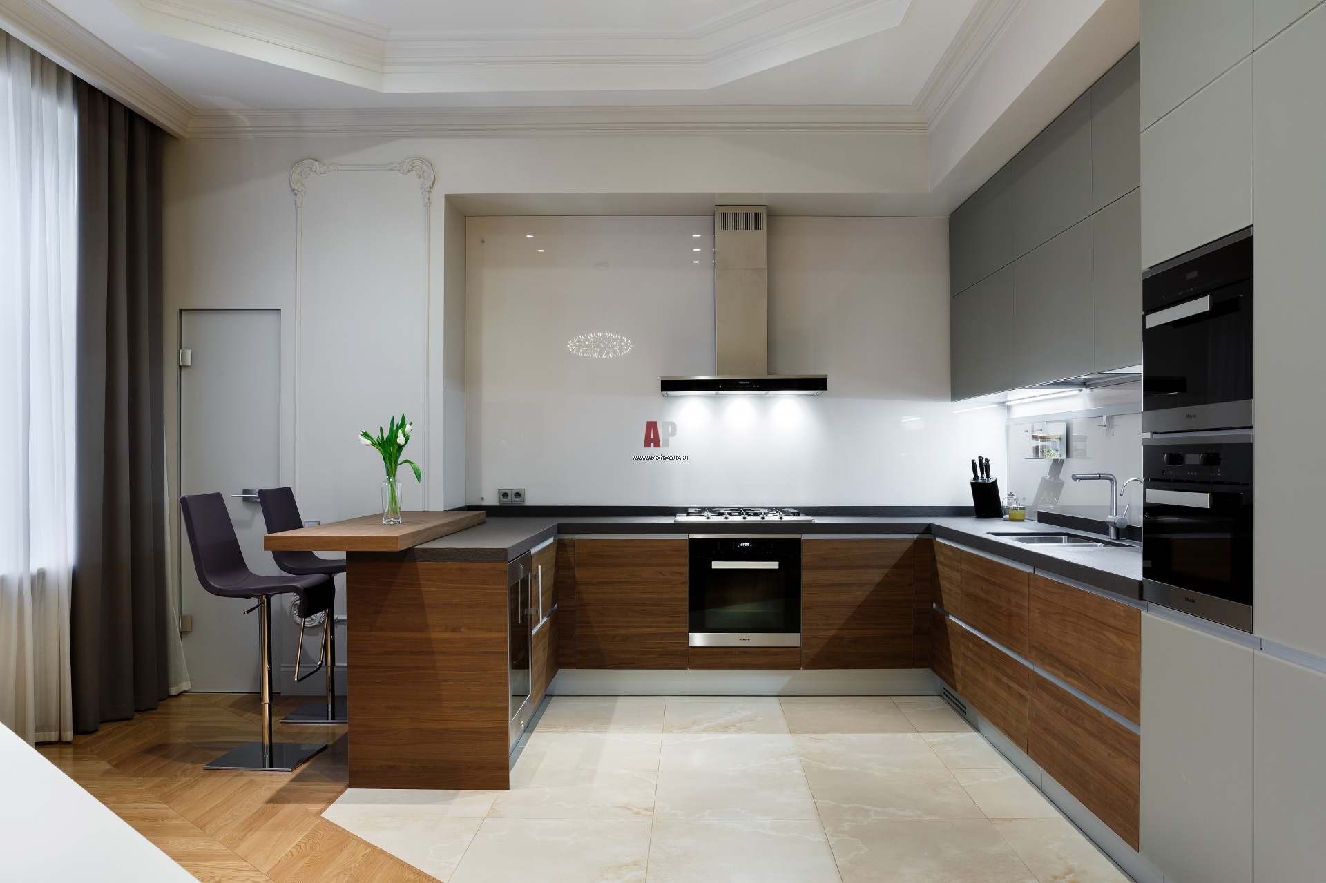 Кухня выполнена в лаконичном стиле. С современной отделкой сочетается тонкая гипсовая лепнина стенах – элегантный классический элемент. Кухонный гарнитур, Valcucine.