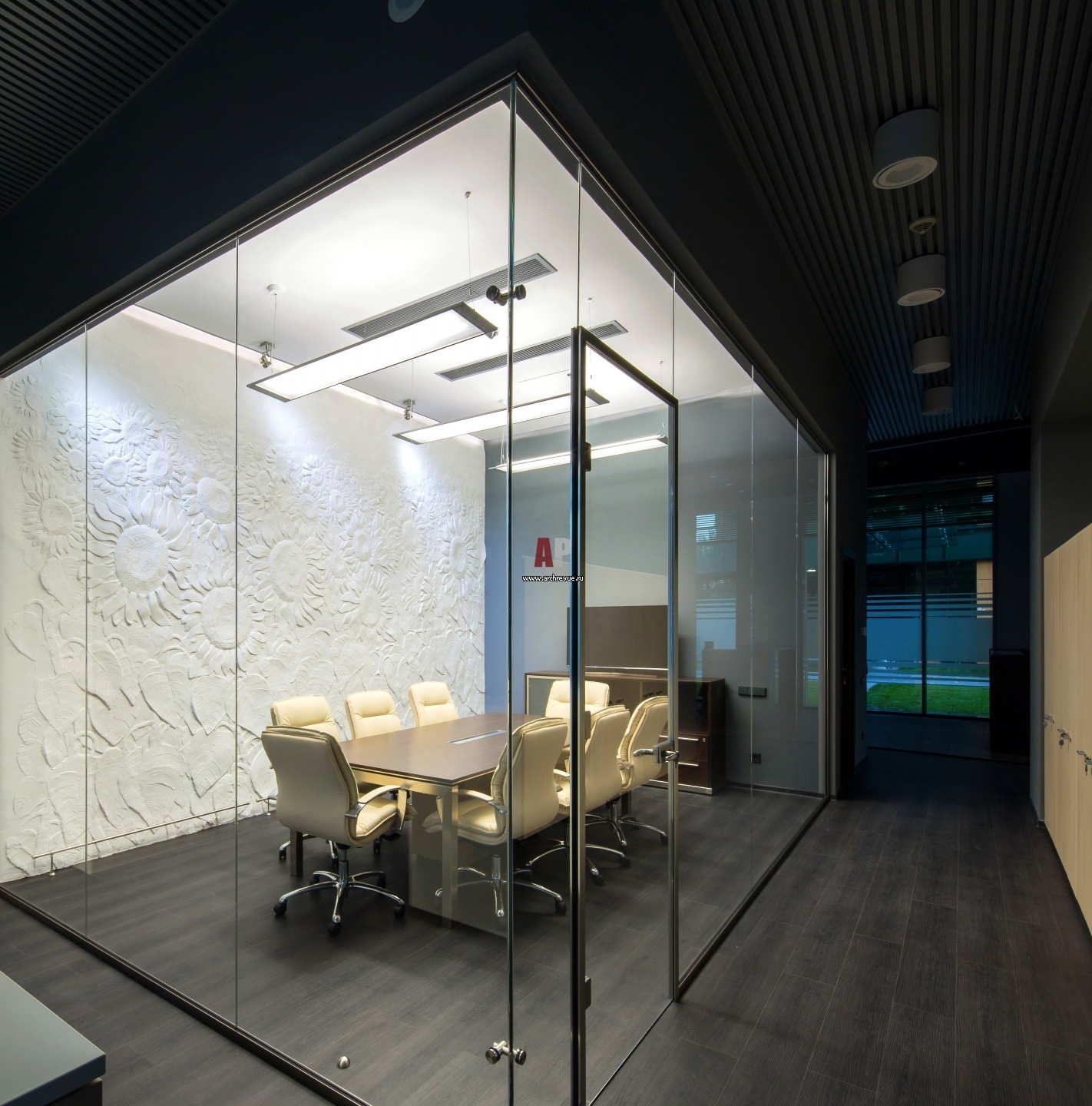 Благодаря перегородками из прозрачного стекла в главной переговорной монументальные белоснежные барельефы отлично просматриваются из холла.