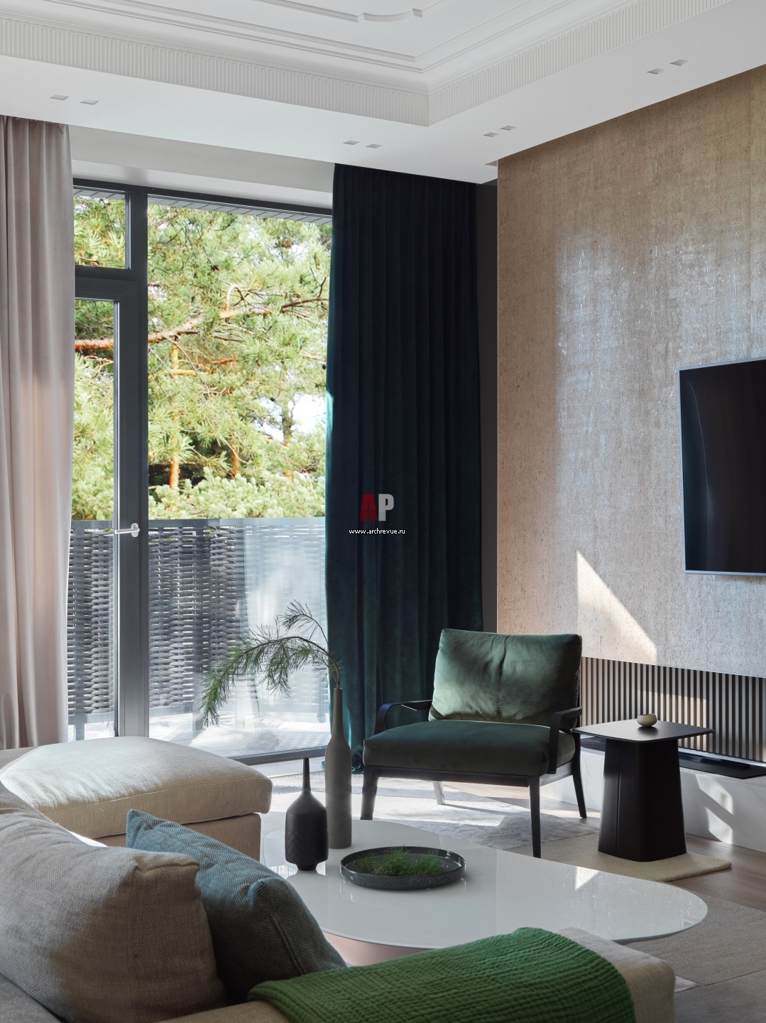 Одна стена в гостиной оформлен обоями с природной текстурой, Thibaut, коллекция Natural Resource. Зеленый плед, H&M Home.