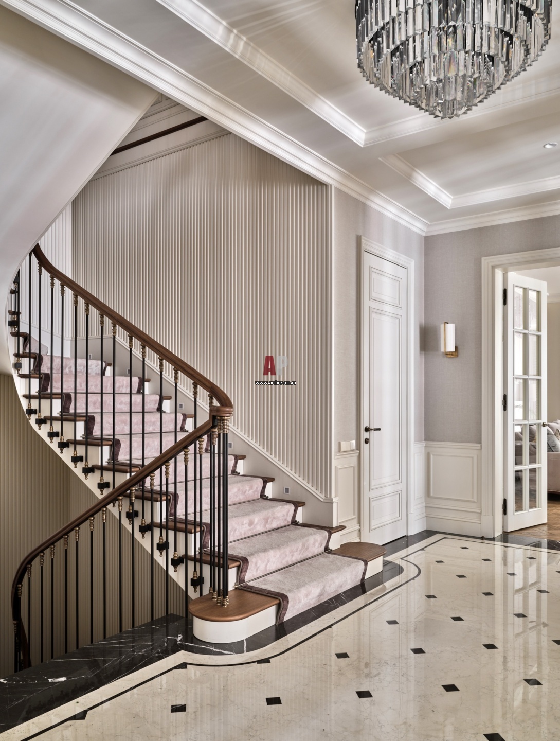 Лестничный холл. Стены облицованы мебельными панелями с филенками в сочетании с текстильными обоями. Ступени лестницы облицованы мрамором, деревянный поручень поддерживают изящные кованые балясины.