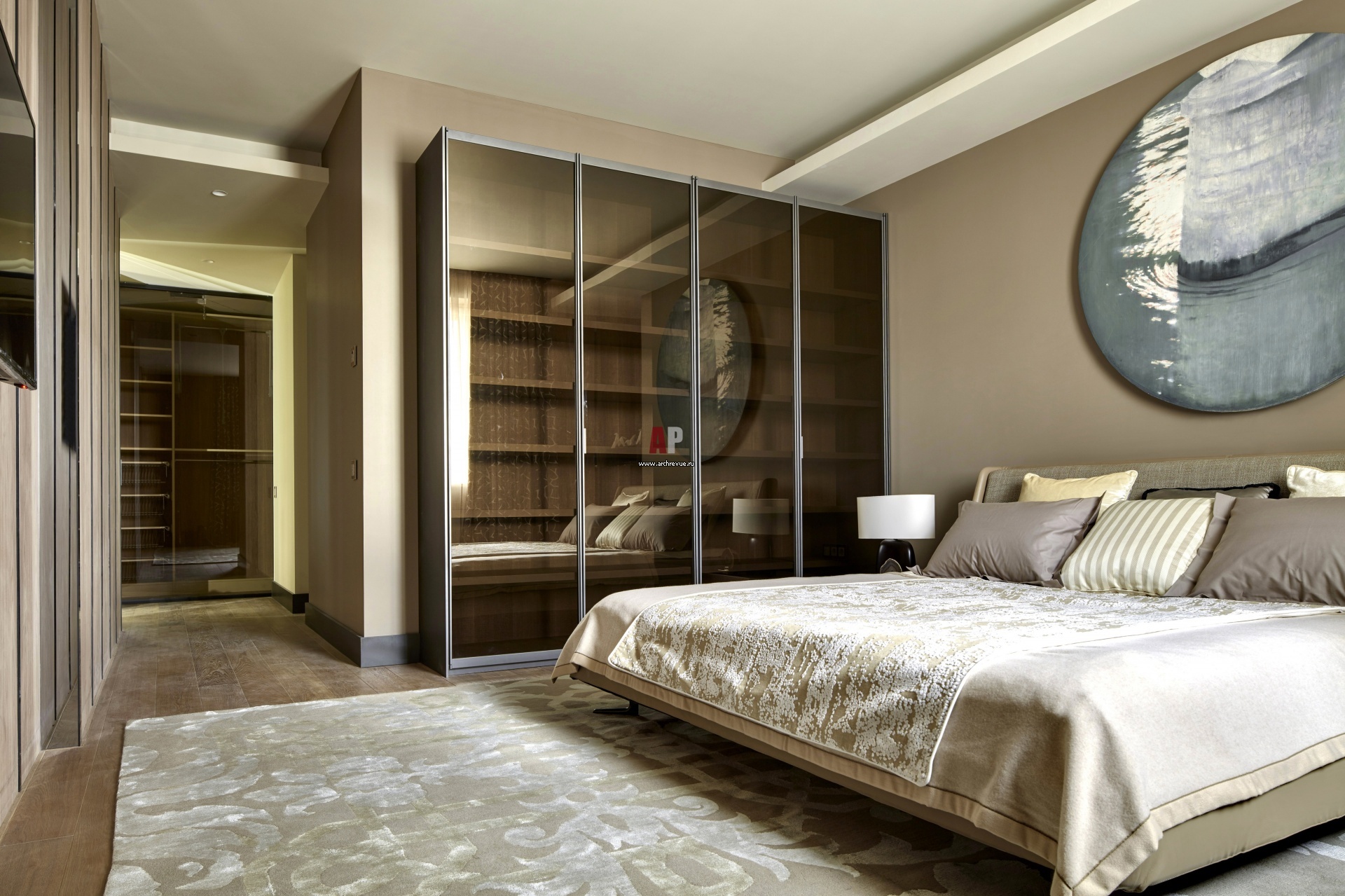 Фото интерьера спальни в бежево-кофейных тонах. Прозрачные дверцы стеклянного встроенного шкафа тонированы в коричневый цвет. Шкаф, Poliform. Массивная половая доска, тонированный дуб, поставщик «Мир Паркета».