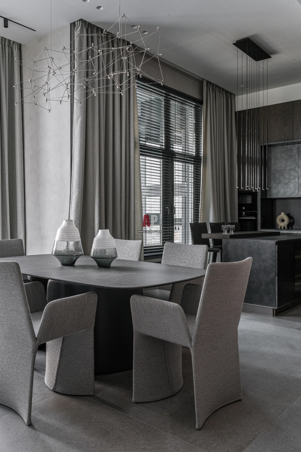 Cтоловая зона в общей гостиной. Стол и стулья, Bonaldo. Металлический светильник-паутинка над столом, модель Sozvezdie.