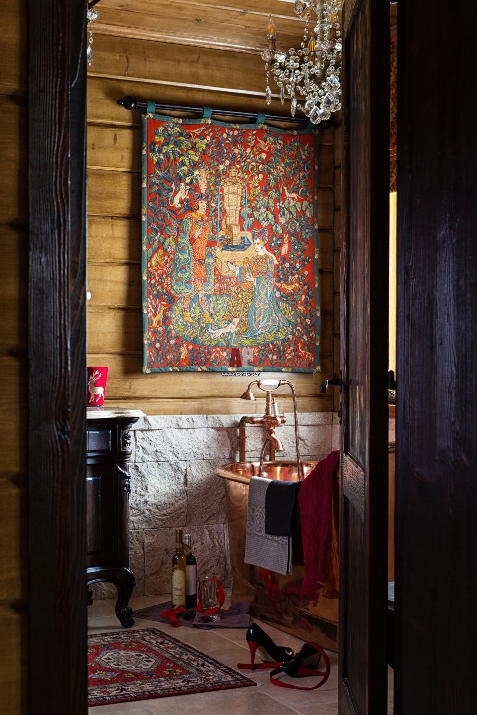 В доме три санузла, и все они абсолютно разные по настроению и декору. Вид из хозяйской спальни на главный санузел. Низ стены декорирован брутальным колотым камнем.