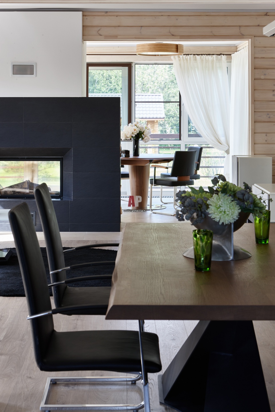 Интерьер дома из бруса выглядит неперегруженным и современным.