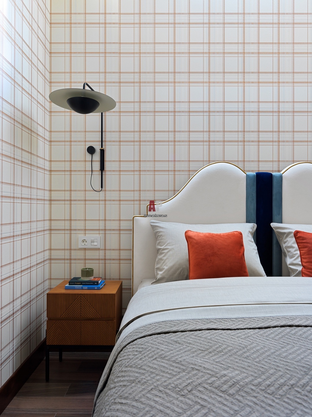 Небольшая гостевая спальня также в цокольном этаже. Кровать сделана на заказ. Обои в клетку и бра черного цвета дают контрастность и выгодно масштабируют пространство.