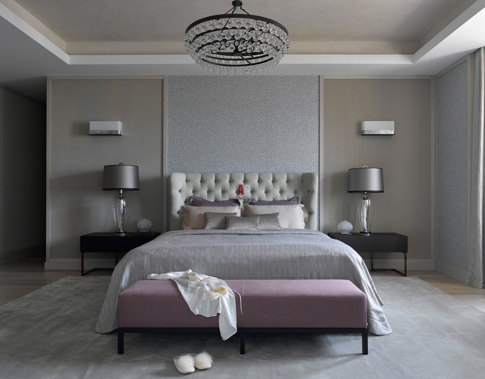 Респектабельная квартира для семьи бизнес-леди. Спальня хозяйки. Люстра, Robert Abbey. Бра, Contardi. Потолок покрыт поталью.