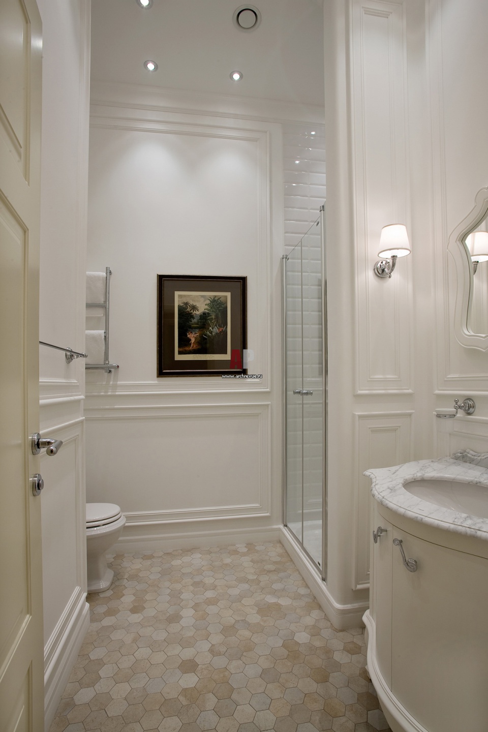 Белый гостевой санузел. На полу – керамогранит восьмигранной формы. На стенах – гравюры, подобранные и оформленные авторами проекта.