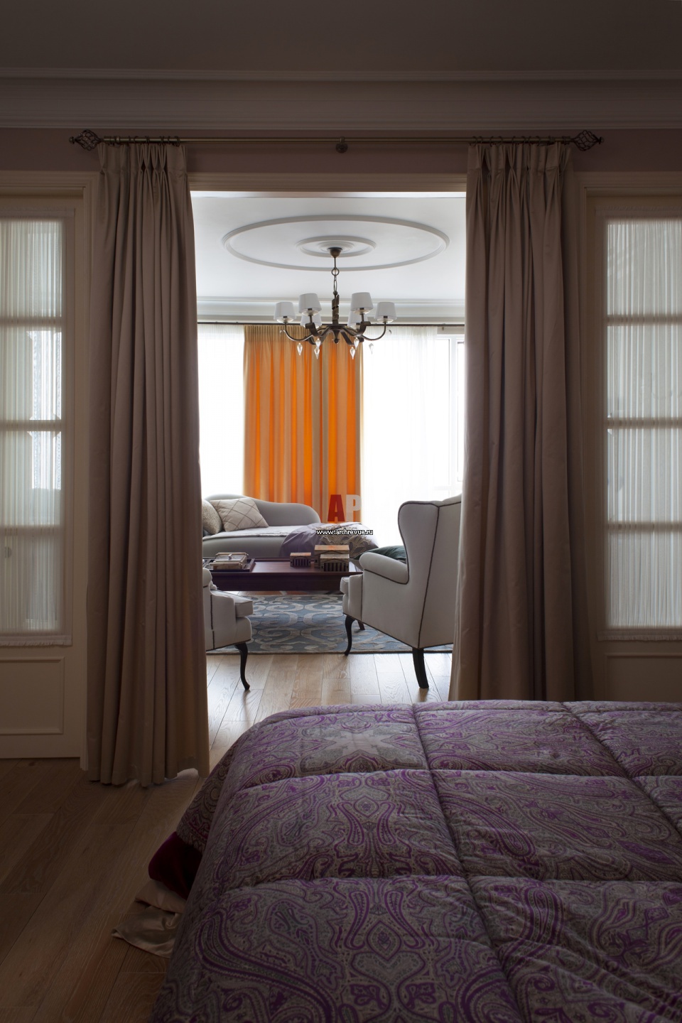 Вид из спальни в гостиную. Специалист по фэн-шуй рекомендовал разделить спальню и гостиную не коридором, а раздвижными перегородками. Деревянные перегородки со вставками из стекла обеспечивают помещение без окон естественным светом.