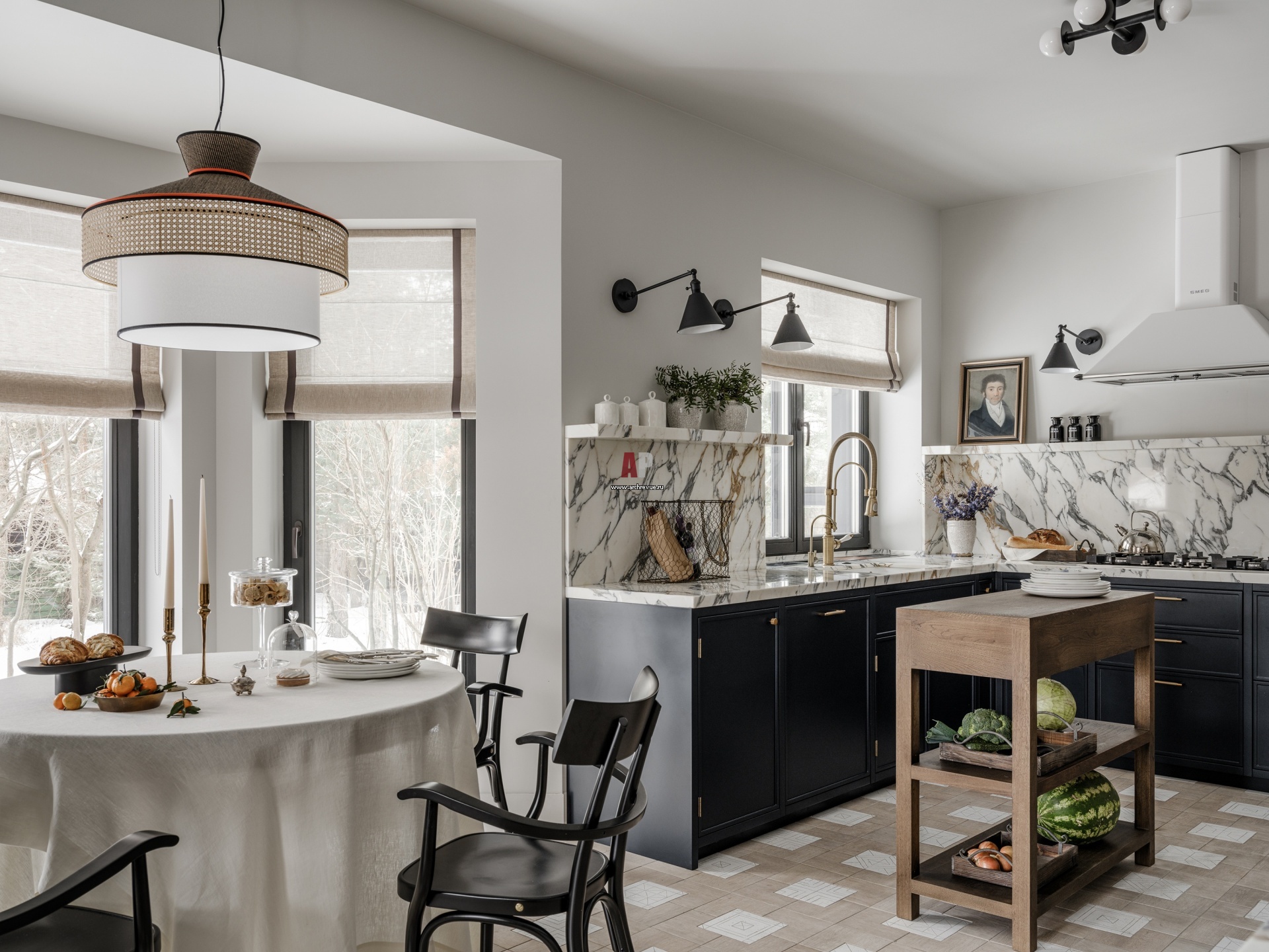 Кухня с зоной для завтраков. Кухонная мебель, остров, обеденный стол и буфет, на заказ. Потолочный свет и бра, Visual Comfort & Co. На полу – плитка в средиземноморском стиле, Wow, коллекция Puzzle.