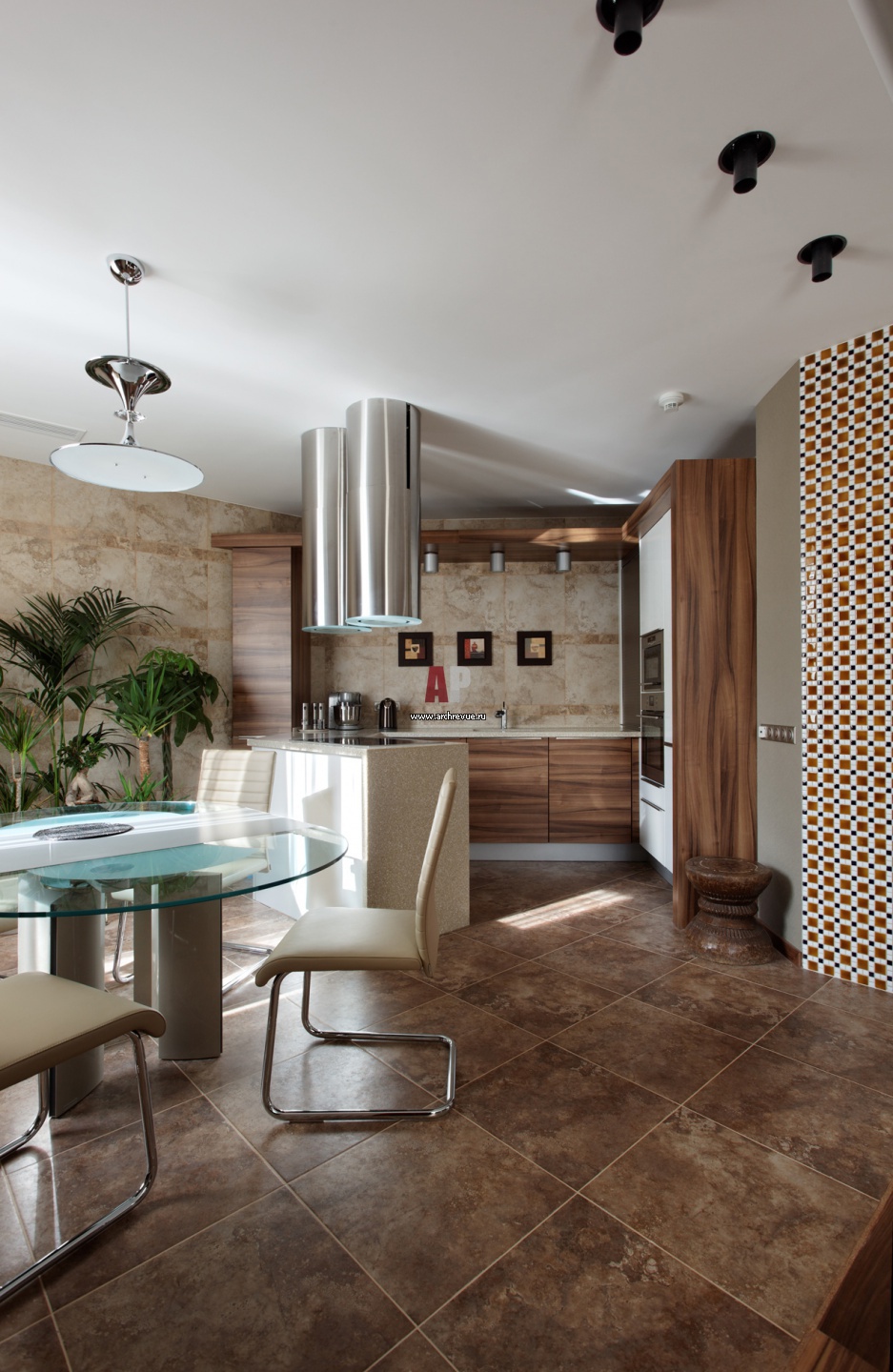 Кухня в современном стиле в бежево-песочной цветовой гамме. Фасады кухонного гарнитура SachsenKüchen выполнены из дерева с живописной фактурой. Вытяжка представляет собой две металлические трубы и выглядит стильно и актуально.