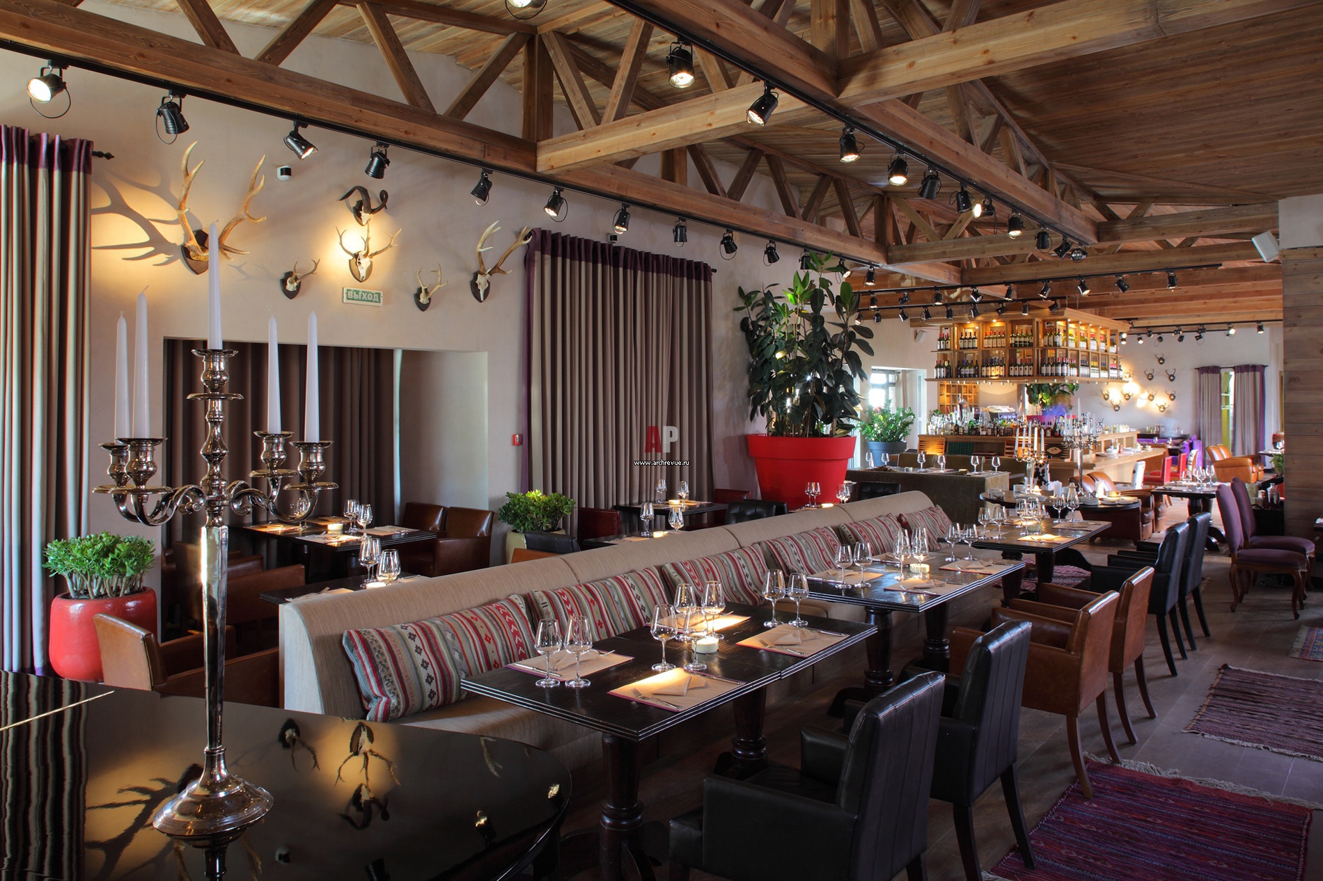 Потолки первого этажа акцентированы конструкцией из дубовых балок, изготовление «Скара». В них вмонтировано профессиональное световое оборудование.