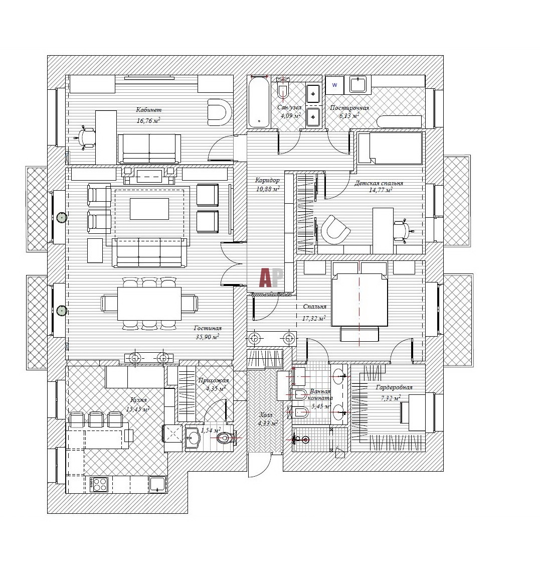 План большой квартиры, объединенной из трех. Общая площадь – 140 кв. м.