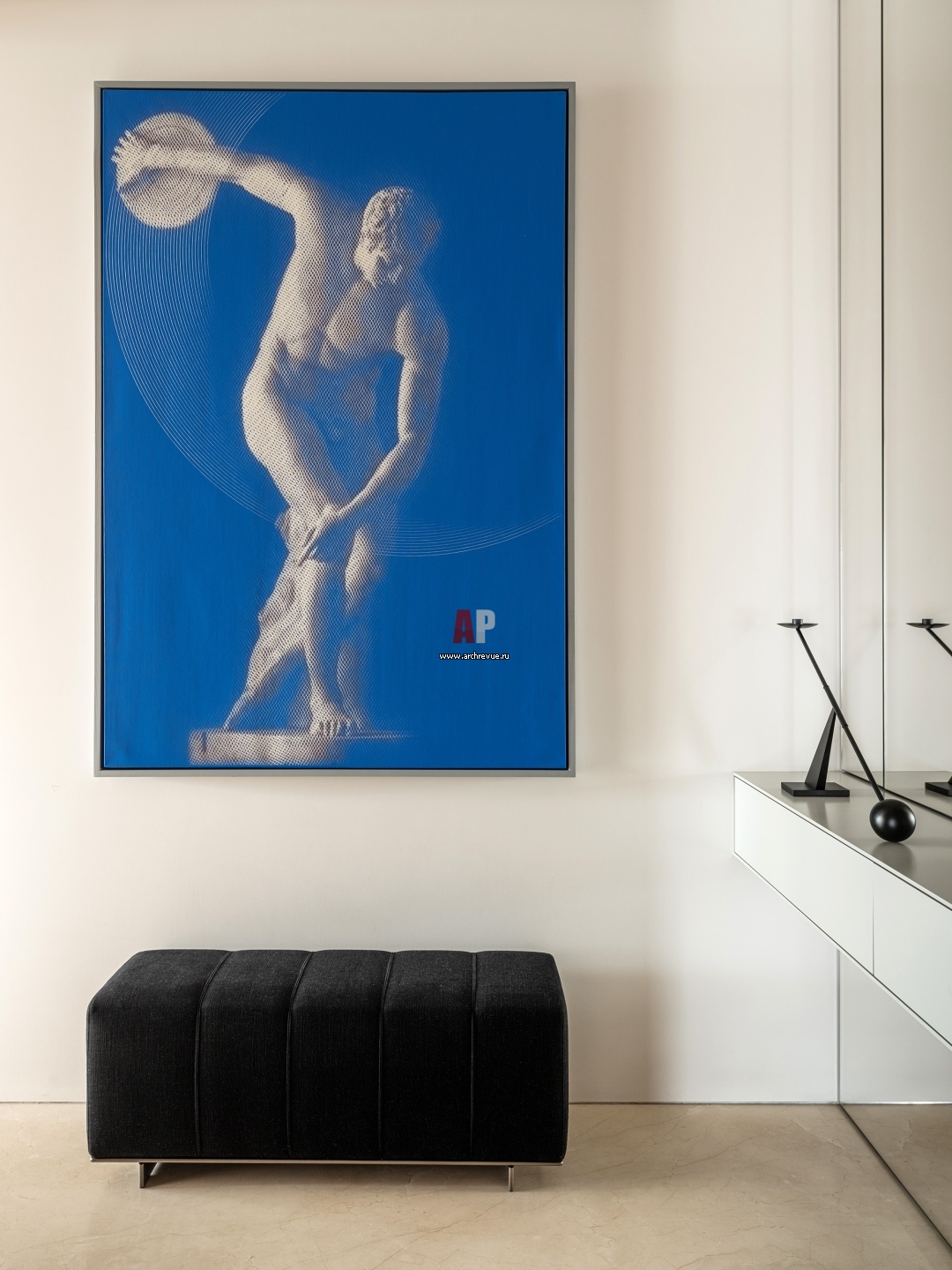 Видовая квартира с современным искусством. Интерьер прихожей. Главный акцент в минималистичном интерьере – работа «Дискобол» Егора Осипова.