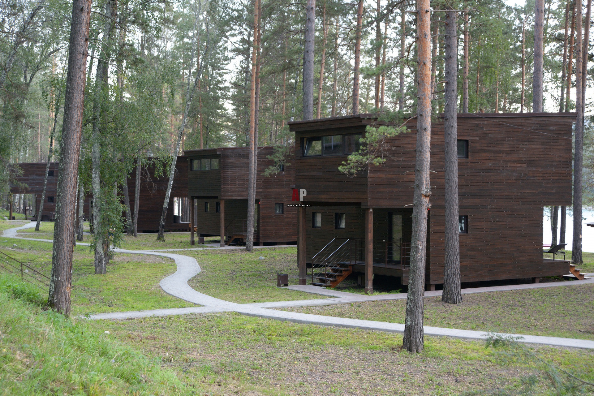Кроме главного здания по территории разбросаны пять стометровых коттеджей, для строительства которых архитекторы применили те же стилистические приемы и материалы, что в решении основного здания.