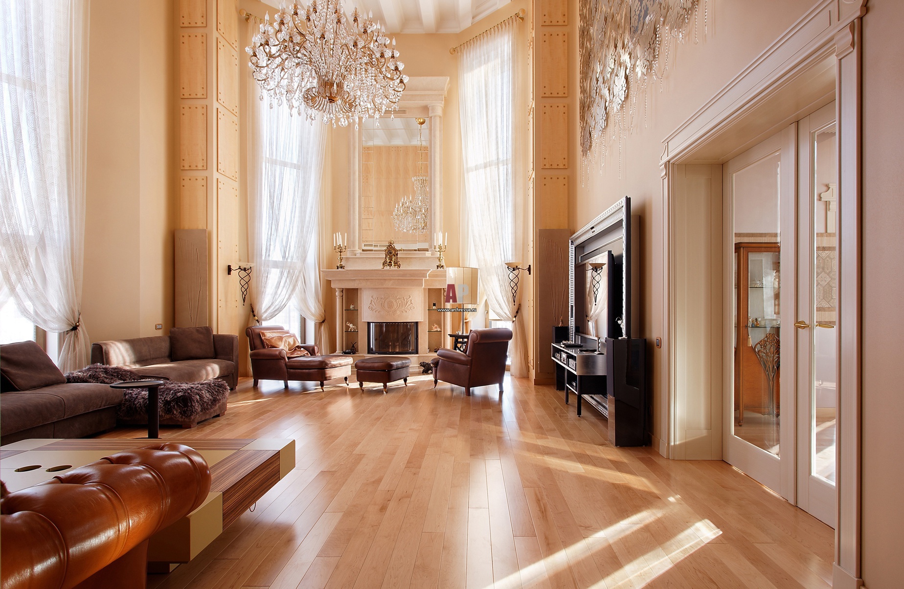 Ощущению простора и воздуха служит пастельная цветовая гамма, паркет из натурального ясеня, панели из сикомора и фактура травертина.