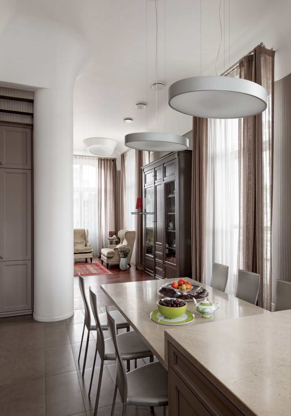 Кухня находится в общем пространстве со столовой в помещен6ии с высотой потолка 4,5 метров.
