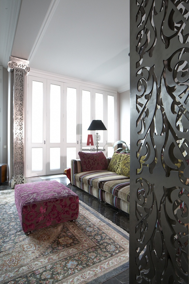 Вид на диванную группу. Деревянные колонны выполнены в технике лазерной резки и выкрашены в сложный серебристый цвет. Работы по дереву, компания «Папа Карло».