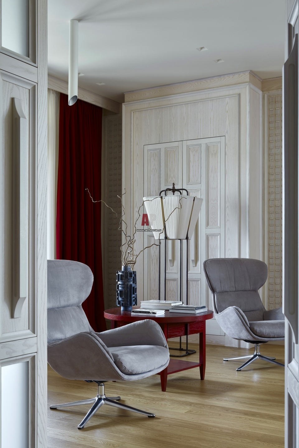 Зона отдыха в гостиной. Кресла и журнальный стол, BoConcept. Торшер, Aldo Bernardi. Удлиненные цилиндрические светильники Nail, Centrsvet.