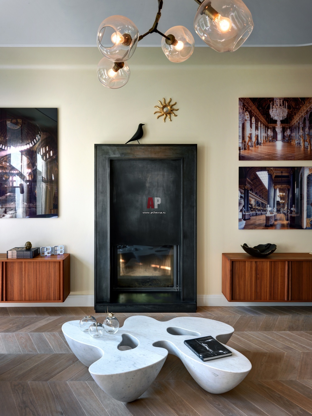 Каминная зона в гостиной. Журнальный столик из цельного блока мрамора по дизайну Эммануэля Бабледа. Камин с металлическим порталом двусторонний, вторая сторона выходит в столовую. Потолочный светильник, Lindsey Adelman Studio.