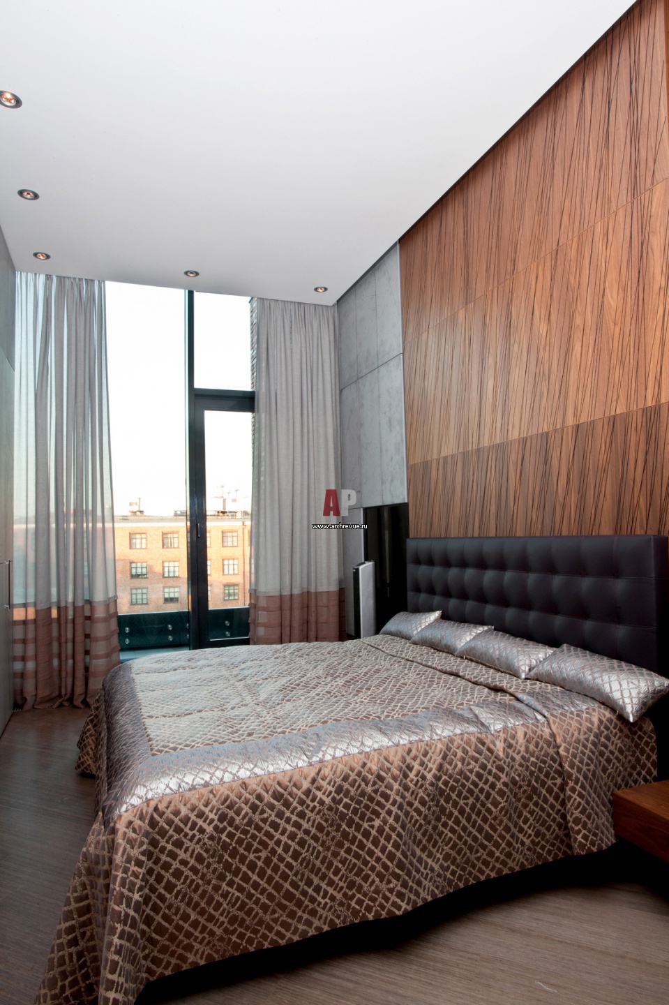 Минималистичный интерьер хозяйской спальни смягчают настенные панели из рыжего дерева. Все предметы мебели и рисунок деревянных панелей имеют четкие геометрические формы. Кровать с черным кожаным изголовьем.