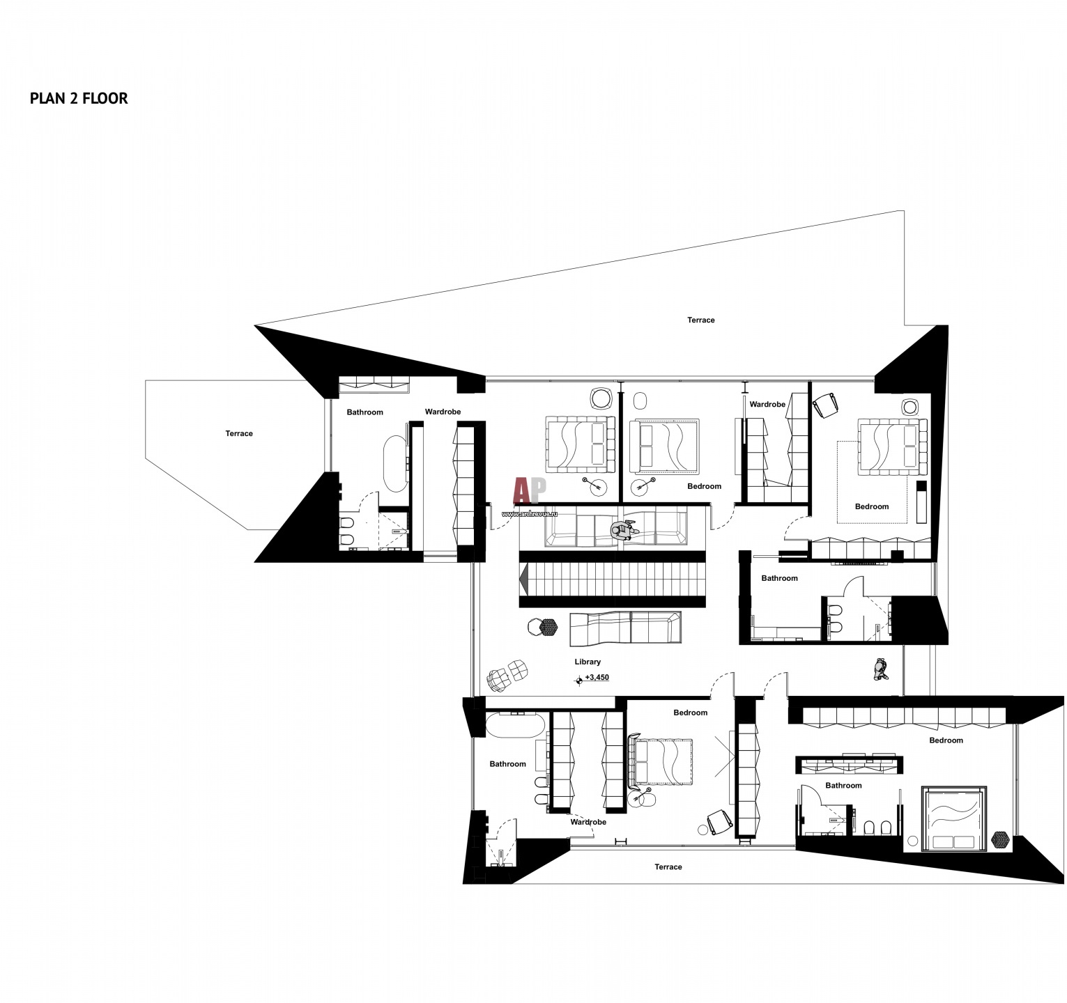 План второго этажа трехэтажного дома с концептуальной архитектурой. Общая площадь – 780 кв. м.