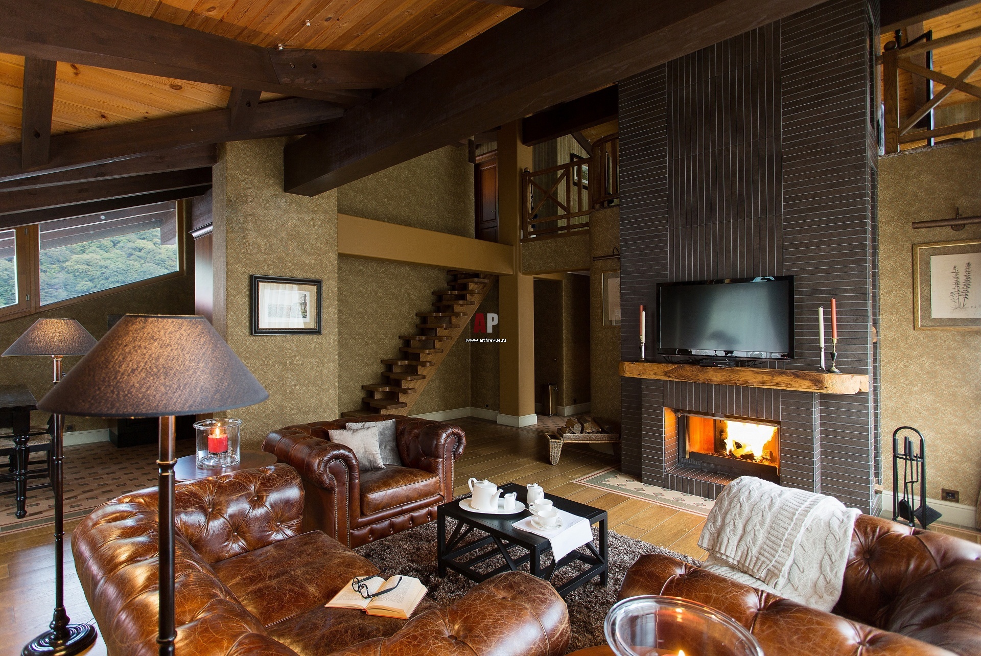 Интерьер гостиной мансардной квартиры в Красной Поляне с элементами стиля шале и английской классики.