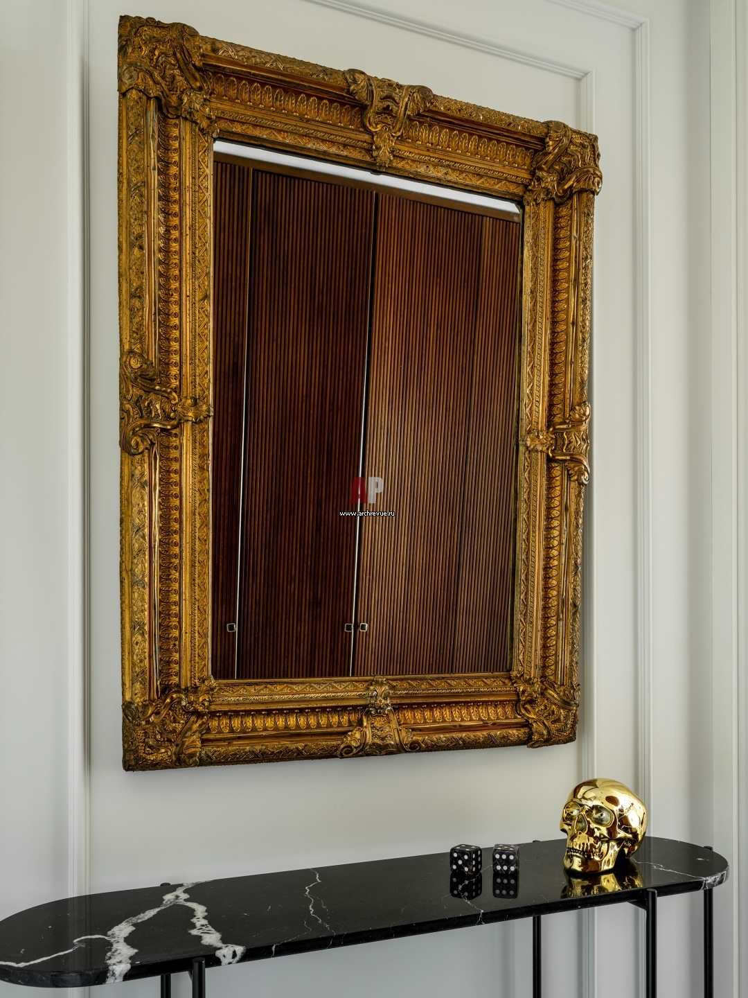 Прихожая. Стены окрашены краской цвета off white. Над черной консолью с каменной столешницей – винтажное зеркало, привезенное из Италии.