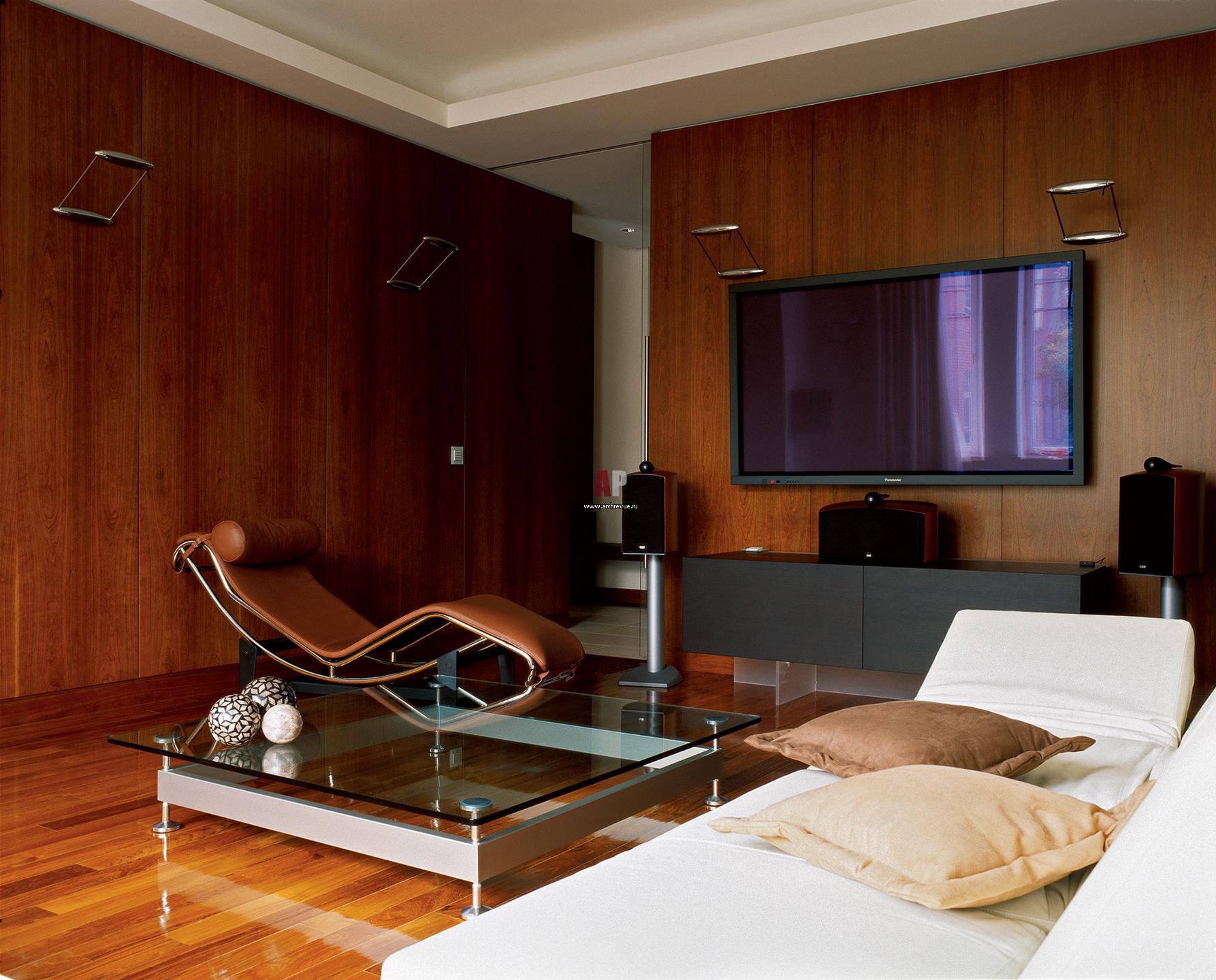 Особый шарм современному пространству, зашитому в дерево, придают технологичные светильники, поставщик «Группа MODUL». А также конструктивистская мебель, поставщик «Флэт-интерьеры». Акустика Bowers&Wilkins, поставщик A&T Trade
