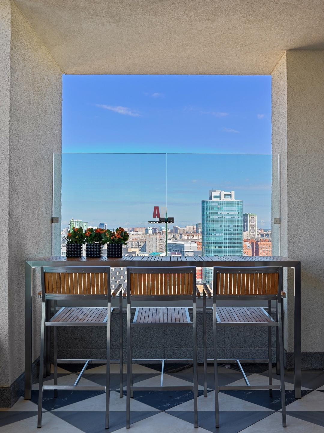 Панорамный пентхаус в Новосибирске. Открытая терраса. Пол облицован водонепроницаемым керамогранитом с геометрическим орнаментом.
