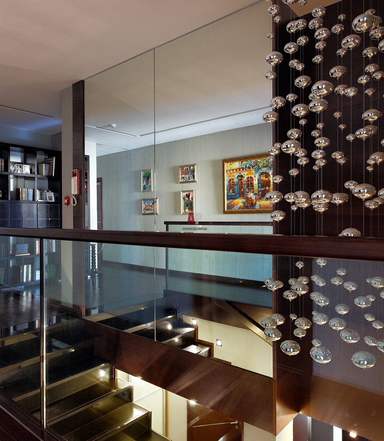 Зеркало во всю стену в лестничном холле зрительно увеличивает пространство в два раза.
