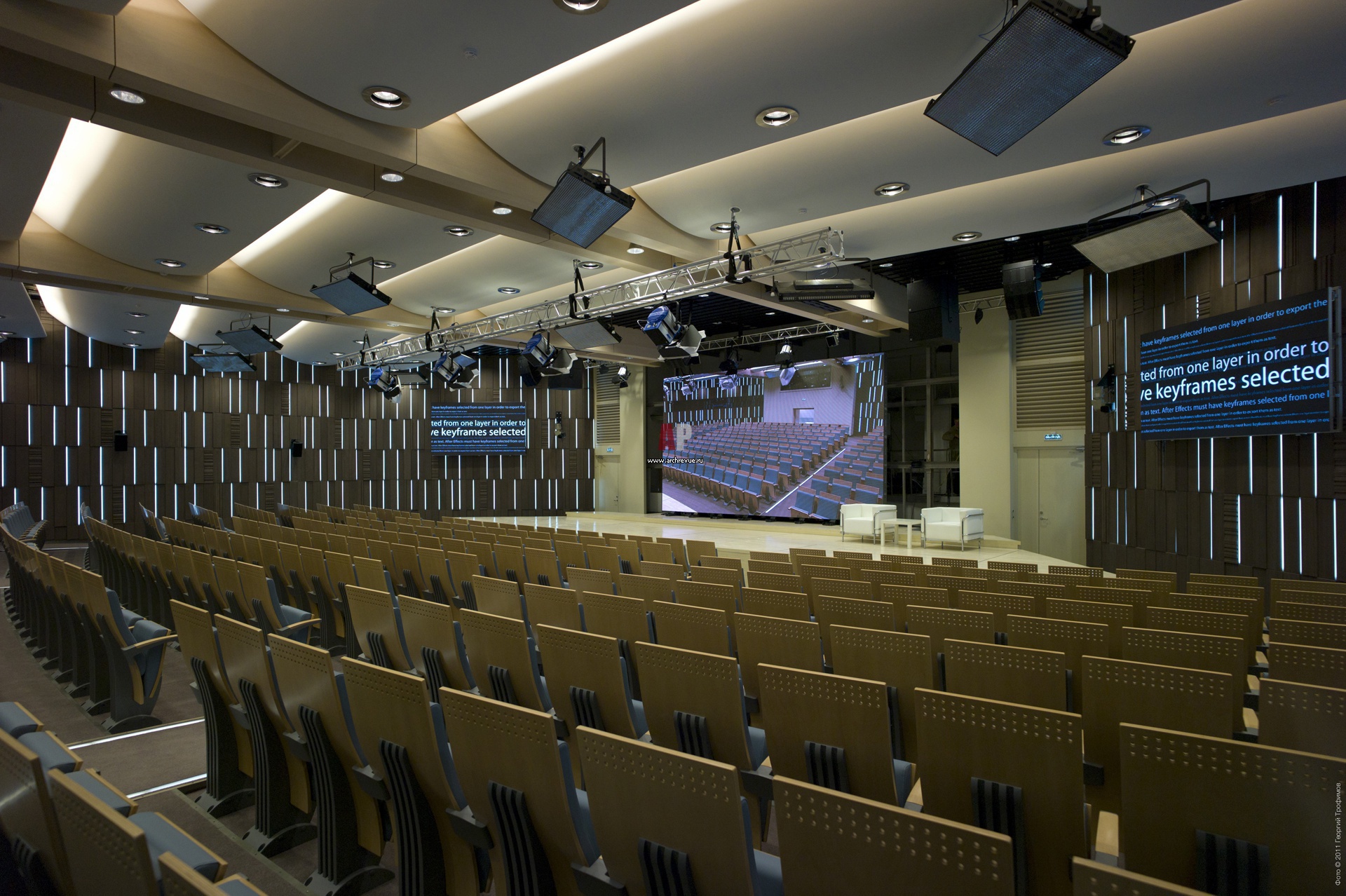 На потолке смонтированы оригинальные акустические конструкции в виде крыльев. Они были смонтированы мастерами компании i-Textile и представляют собой акустические линзы.