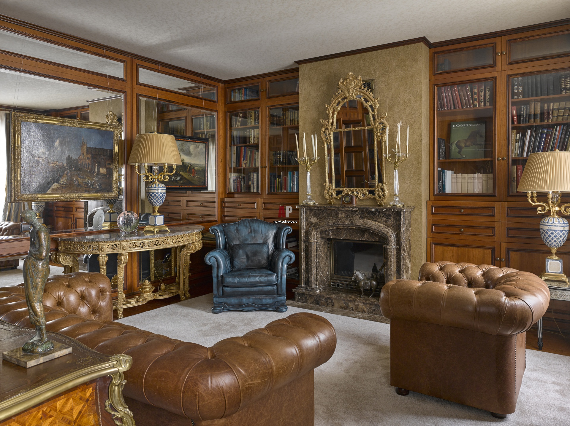 Зона камина с библиотекой в кабинете. Чтобы сделать комнату светлее, полы застелили однотонными коврами, Boccara. Портал камина из мрамора с резьбой сделан на заказ.