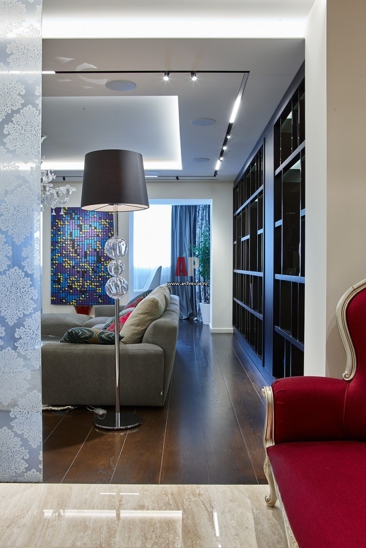 Гостиная объединена с прихожей широким проемом. Авангардная живопись добавляет интерьеру цвета. Зеркало, Porada.