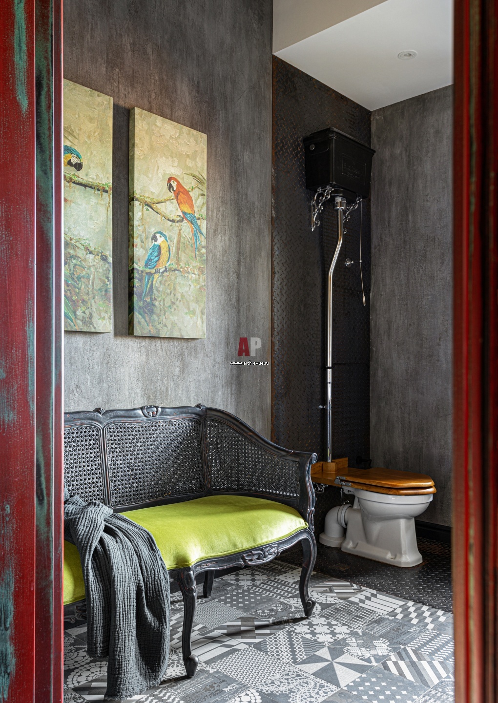 Гостевой санузел на первом этаже. Стены оформлены серой штукатуркой под бетон. Двери с эффектом старения сделаны на заказ.