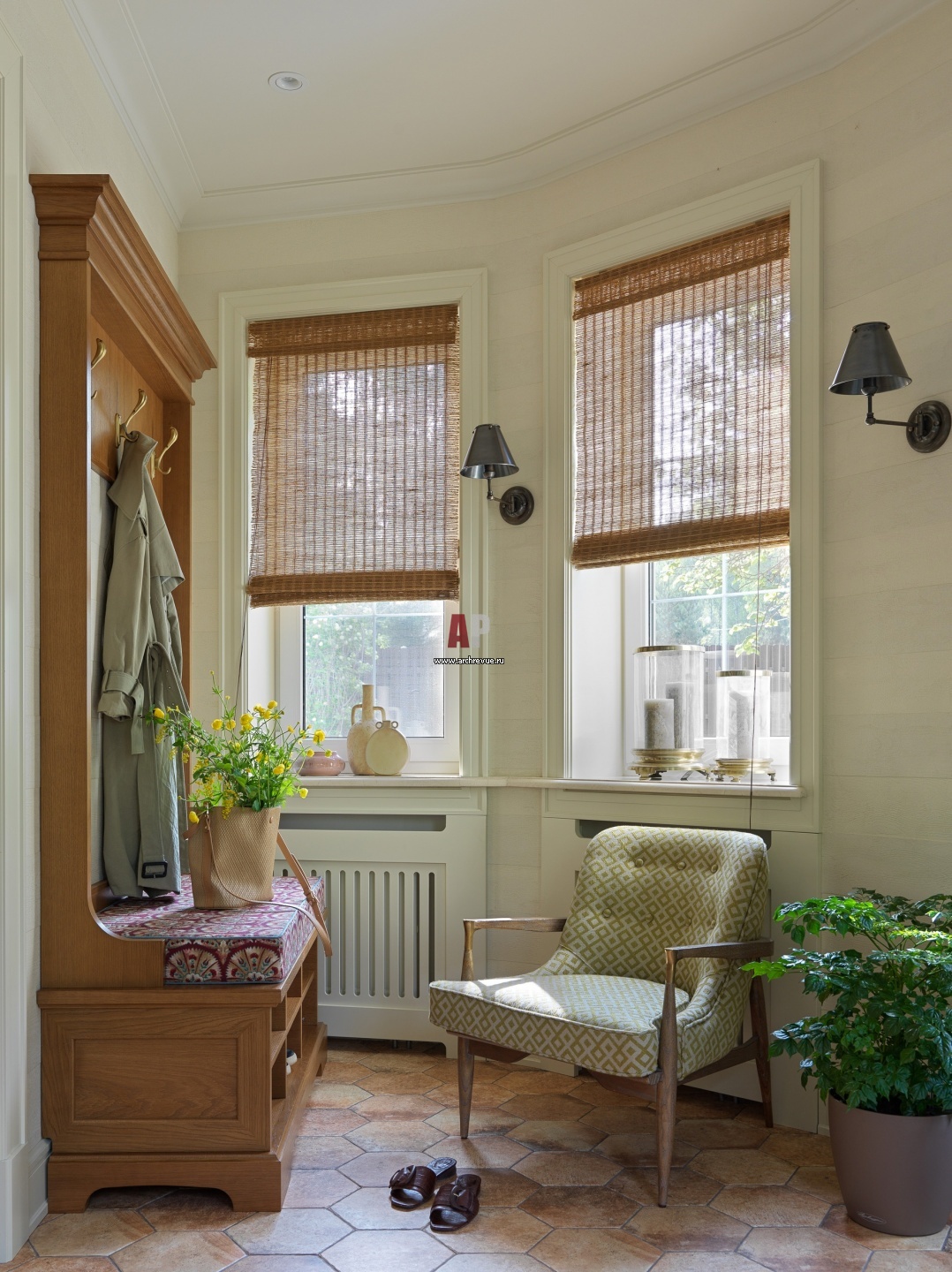 Главный вход. Небольшая полукруглая прихожая похожа на дачную веранду. Стены выкрашены в нежный фисташковый цвет стен, на полу – терракотовая плитка, которые добавляют радости и солнца. Кресла, Bungalows в ткани Carlucci di Chivasso. Бра, Hudson Valley Lighting.