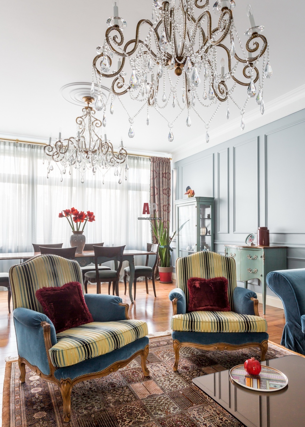 В гостиной современный журнальный стол Tom Dixon и дизайнерский торшер Baxter соседствуют с классическими итальянскими люстрами с хрустальными подвесками и классической мебелью старинной французской фабрики.