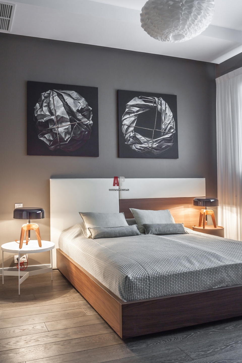 Интерьер современной гостевой спальни выдержан в нейтральных серых тонах. Кровать, прикроватные тумбы, Besana.