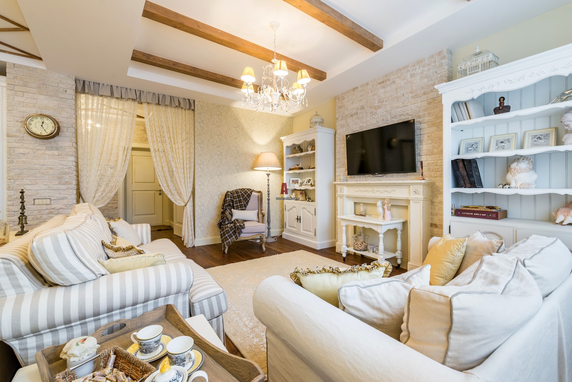 Интерьер гостиной в теплых пастельных тонах с элементами французской классики, стиля шале и Прованс. Потолки оштукатурены, побелены и декорированы деревянными балками с состаренной фактурой. На полу – палубная доска из тика.