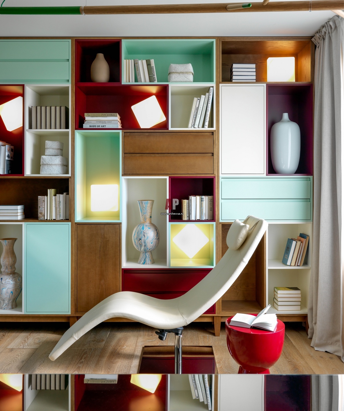 Библиотека в кабинете решена в ультрасовременном стиле. Кресло для релакса, Cattelan Italia.
