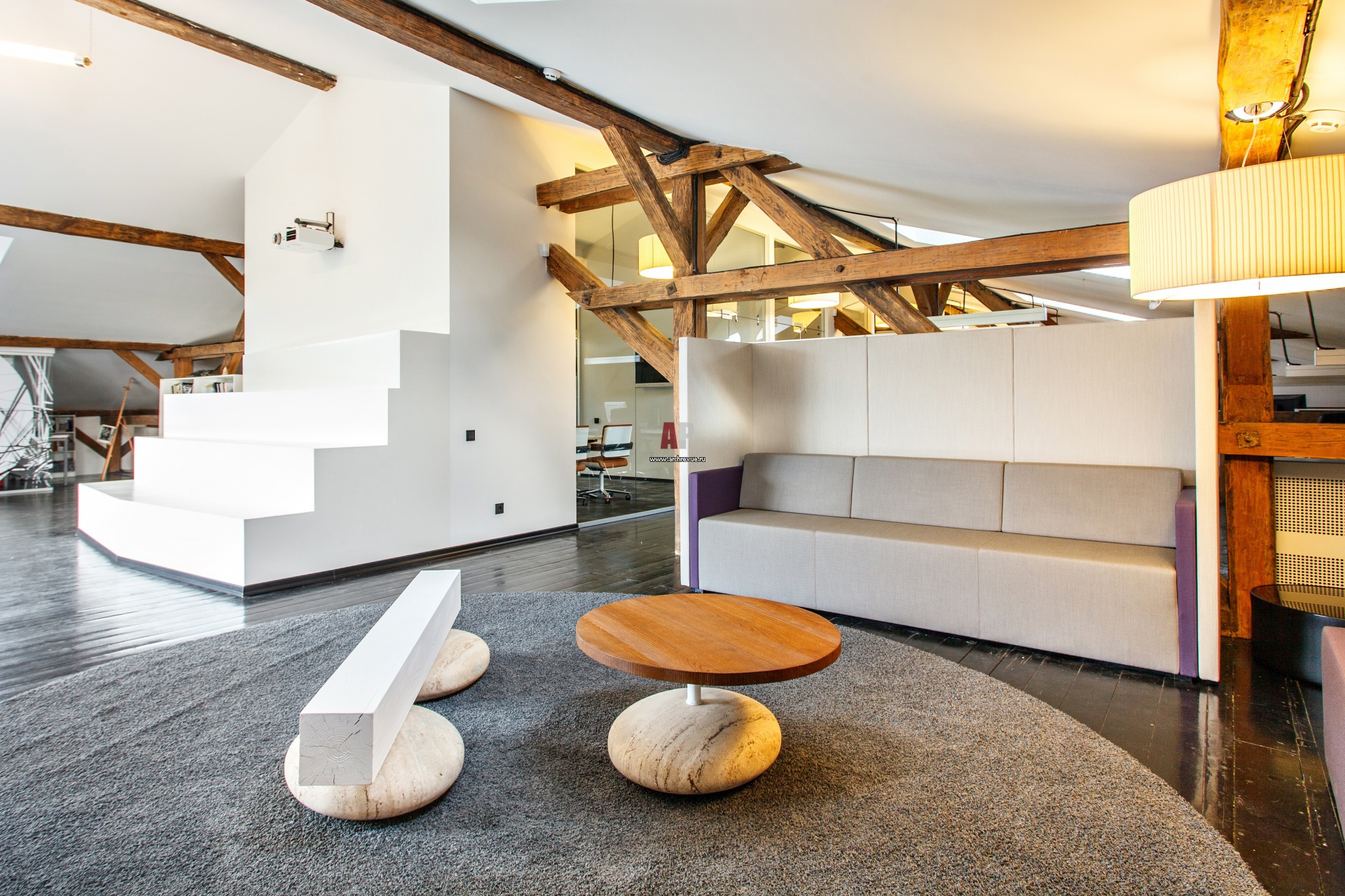 Зона отдыха в офисе. Ступенчатый подиум напротив полукруглого окна задуман как небольшой зрительный зал для просмотра видеопрезентаций.