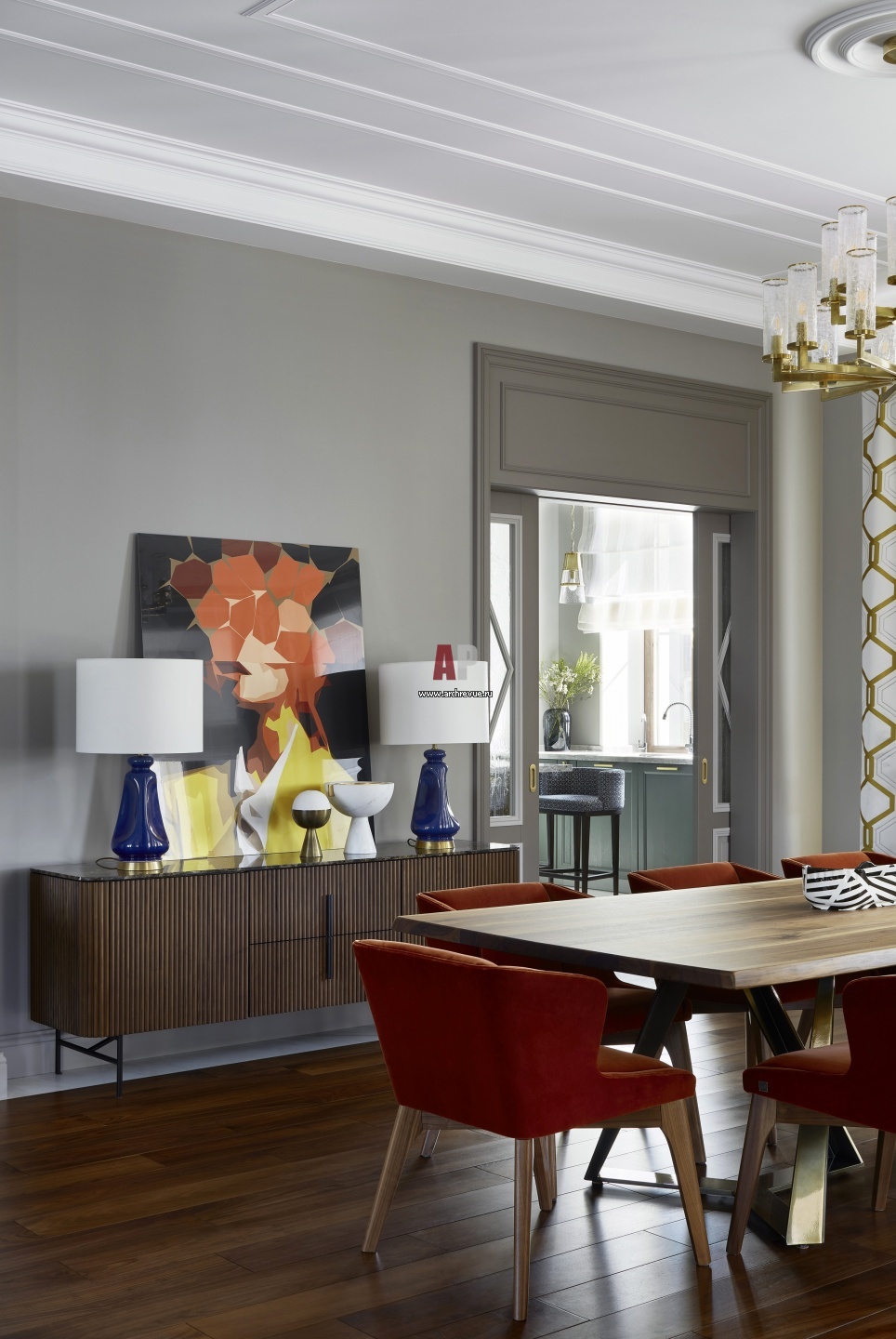Зона столовой связывает гостиную и кухню в общее пространство. Стены оформлены матовой краской нейтрального серого оттенка. На полу – доска из массива ореха.